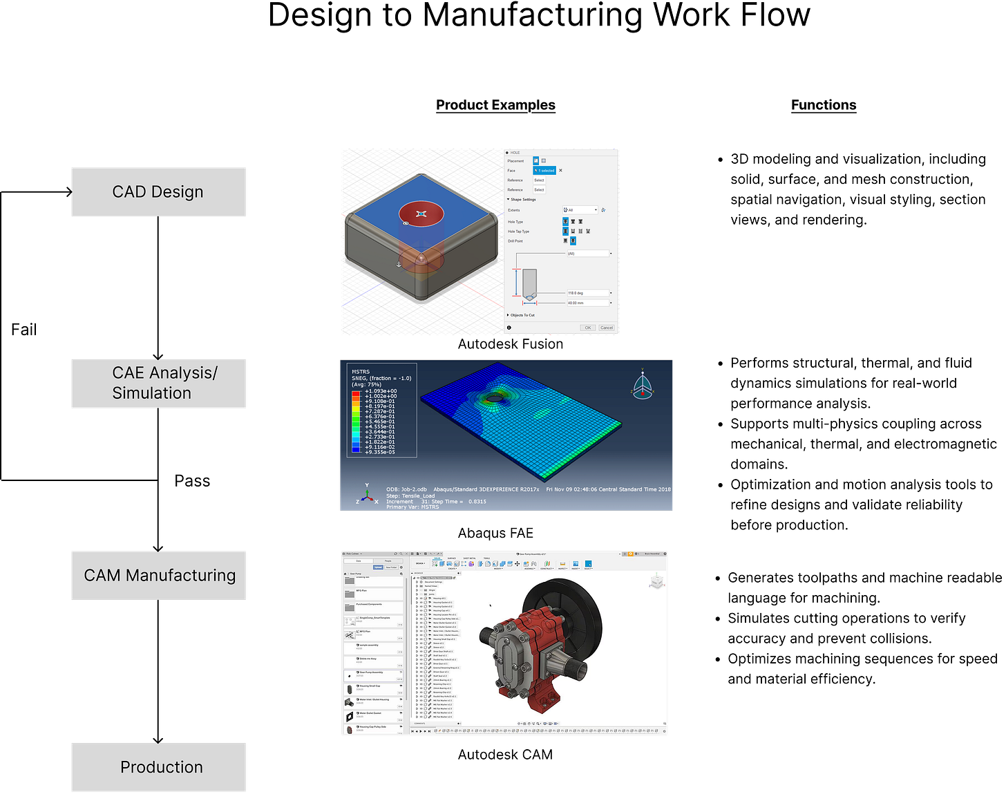 A typical workflow begins when an engineer designs a part in CAD software. To test it under stress, they export to simulation software, losing geometric detail in translation. The analyst runs simulations and returns static reports. Once approved, a manufacturing engineer imports the geometry into CAM software to plan toolpaths, again translating formats and potentially losing tolerance or material data. The final output is G-code that factory machines execute. If a part fails during production, this entire chain runs in reverse through each handoff.